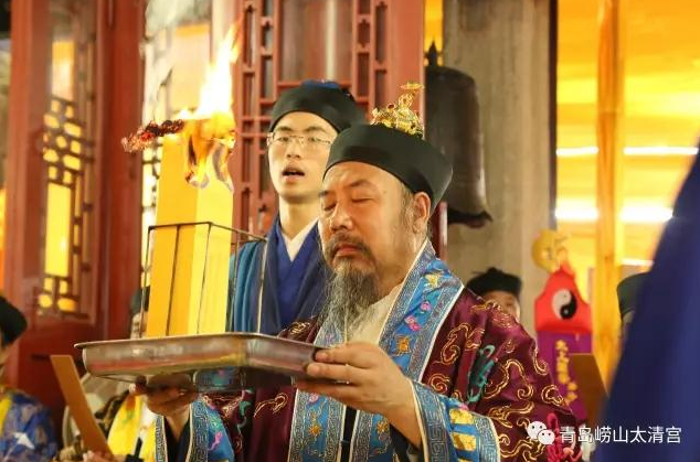 2017年9月4日上午,崂山太清宫戒坛举行了托钵普谢科仪。全真道人云游之钵多为木制,唯全真道教传戒之戒钵方可铜、铁、锡等制,与化乞之钵异也。戒钵不可用斋,乃道教传授戒律之凭证,方丈大律师所传之信物也,故又称“法凭”,寓意衣钵传身也。戒钵为八角形,以阳刻八卦;钵上有盖,阳刻太极;钵下铸传戒地及铸造日期。上午方丈大律师出坛,首座及八大师在整套仙仗引领下,随方丈大律师先后到大律堂、三皇殿、祖堂、灵官殿、元辰殿、元君殿、斋堂、三官殿等一一酬神谢恩,送化疏函。下午,戒坛举行审戒及雷祖朝科。审戒科是新戒将自己所造之种种罪业,于大师座前忏悔并誓愿守戒的科仪。律坛审戒完毕后,大师引领众戒子至方丈寮,听受律师开示。农历七月十五,为中元地官圣诞,按道教传统十四日晚间,戒坛举行了祝寿科仪,方丈大律师率大师一起登坛祝寿。
